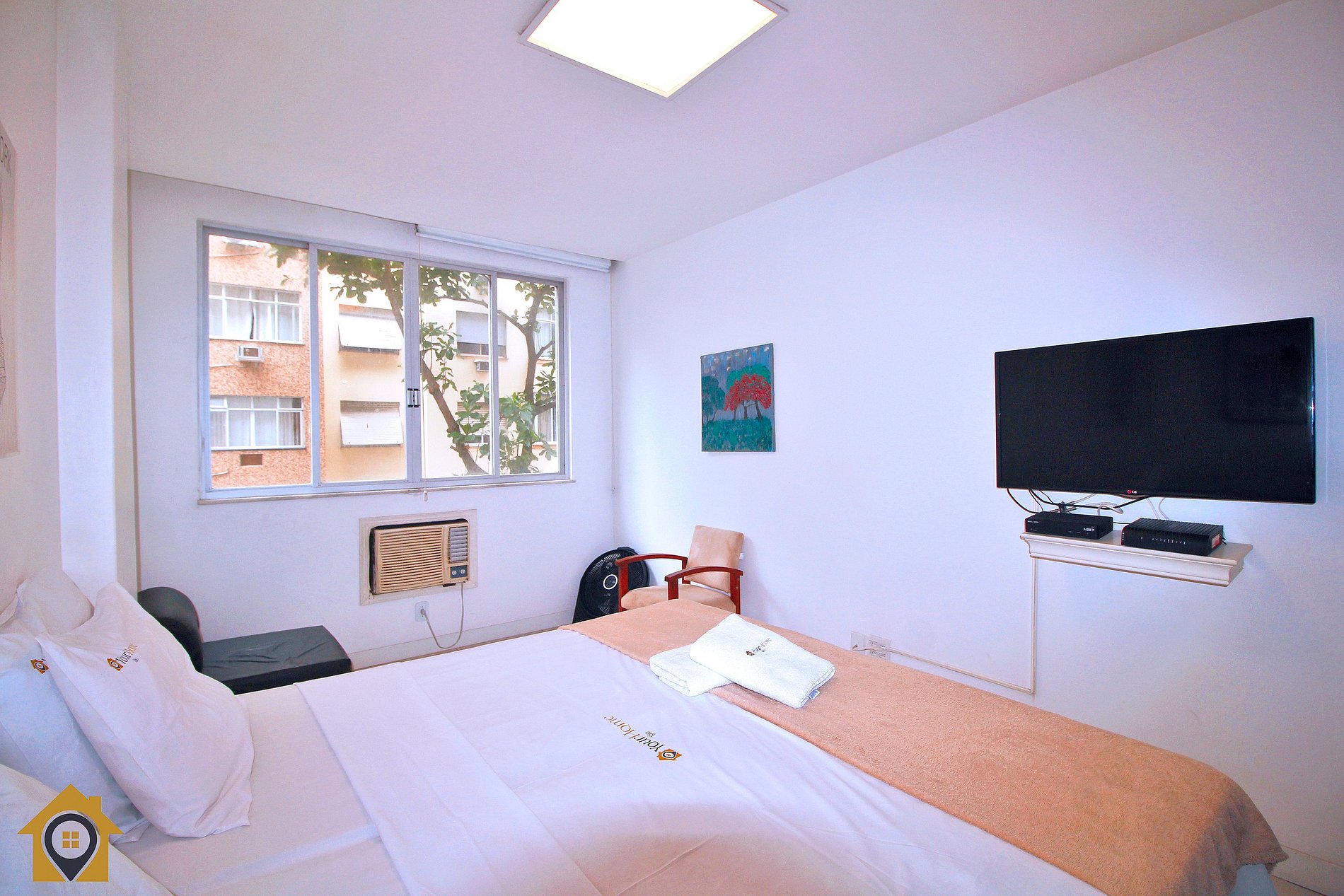 Quarto com cama que pode ser configurada como Queen ou duas de solteiro, sofá-cama de solteiro, poltrona, ar-condicionado, ventilador, TV, armário de duas portas e cortina blackout.