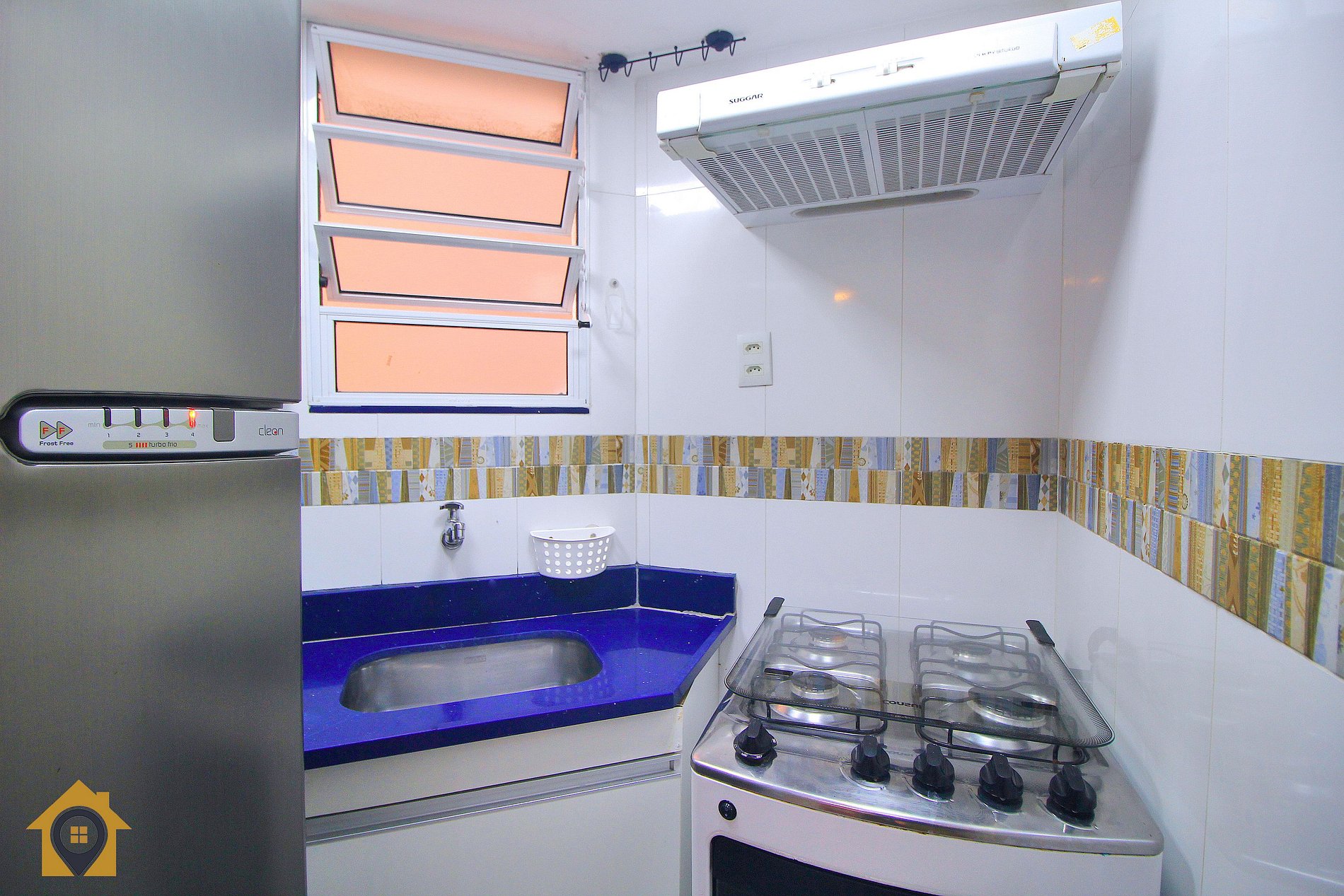 A cozinha é equipada com geladeira frost free, fogão 4 bocas com exaustor e todos os utensílios necessários para cozinhar.