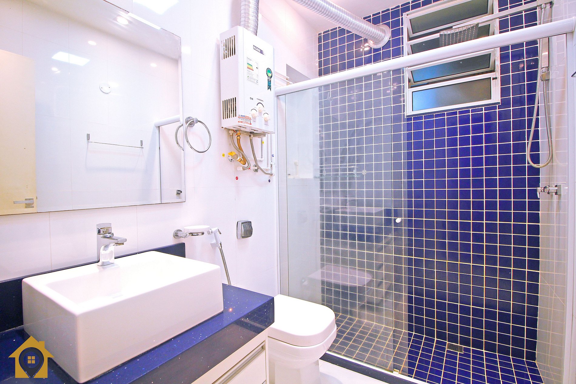 O banheiro é espaçoso, possui espelho grande e sistema de aquecimento a gás, garantindo mais conforto durante o banho.