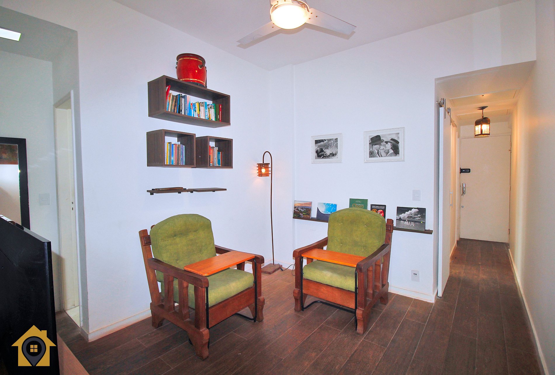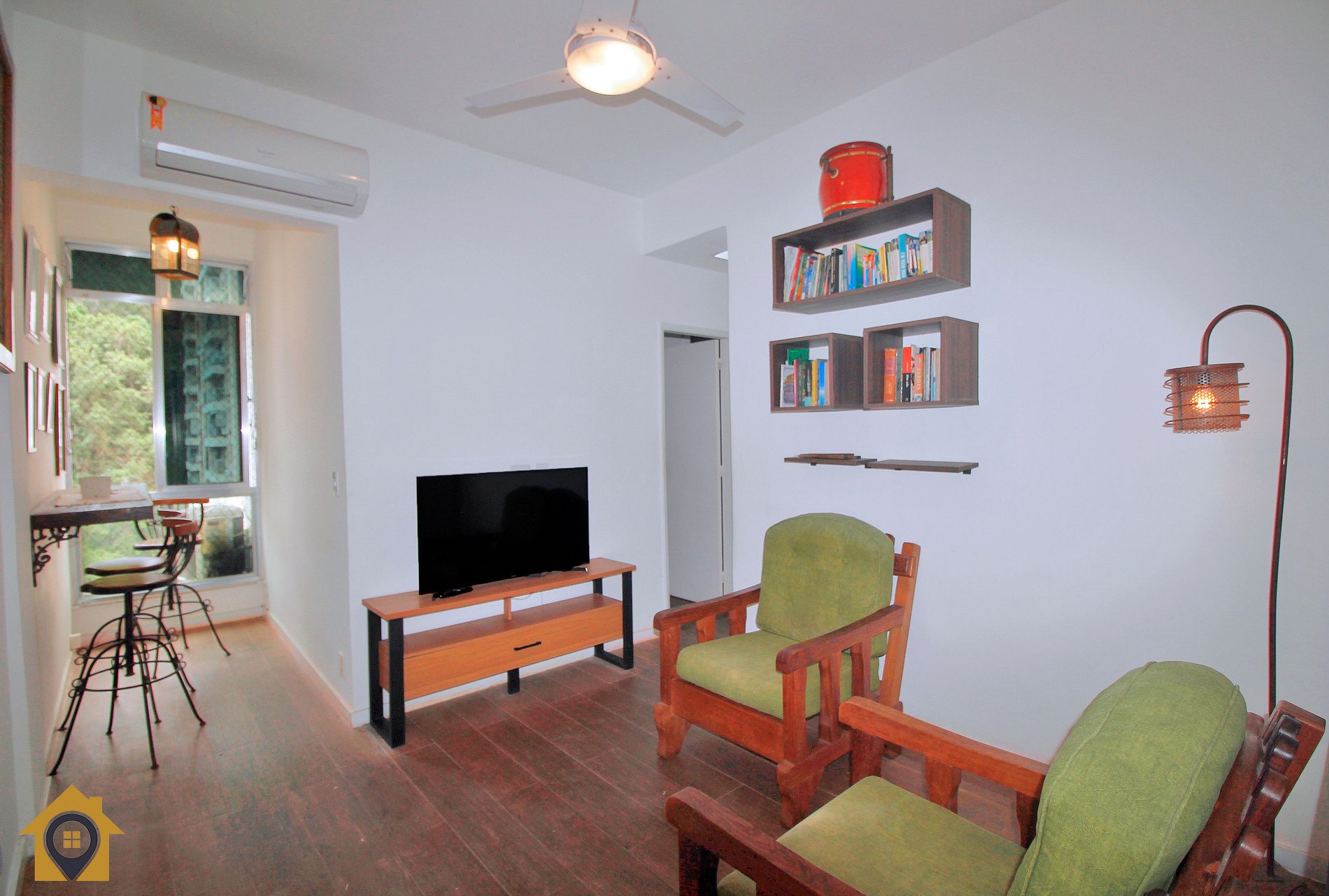A sala é aconchegante e funcional, equipada com Smart TV, duas poltronas, mesa alta com três banquetas, ar-condicionado e ventilador de teto — perfeita para relaxar após um dia de praia ou trabalho.
