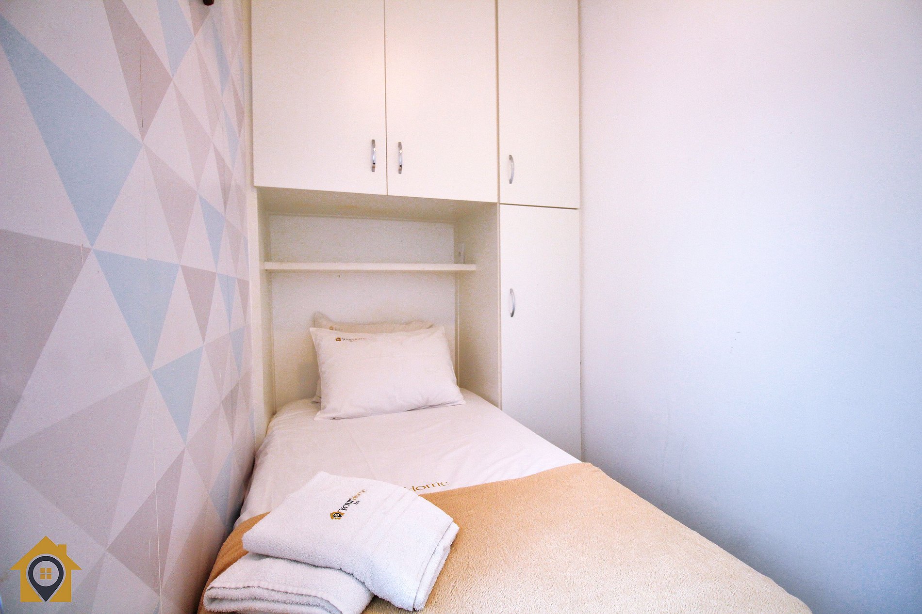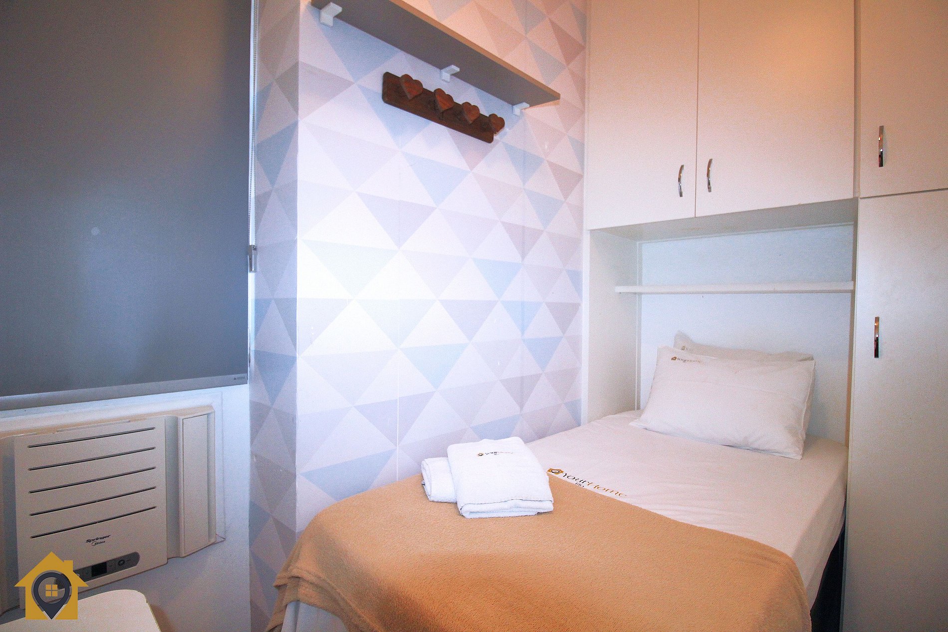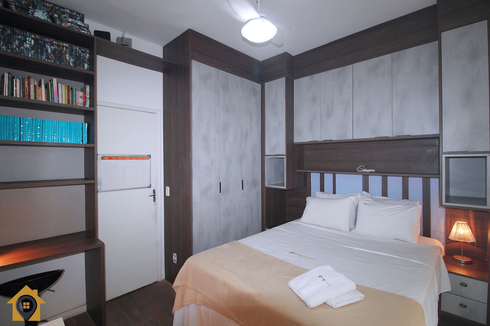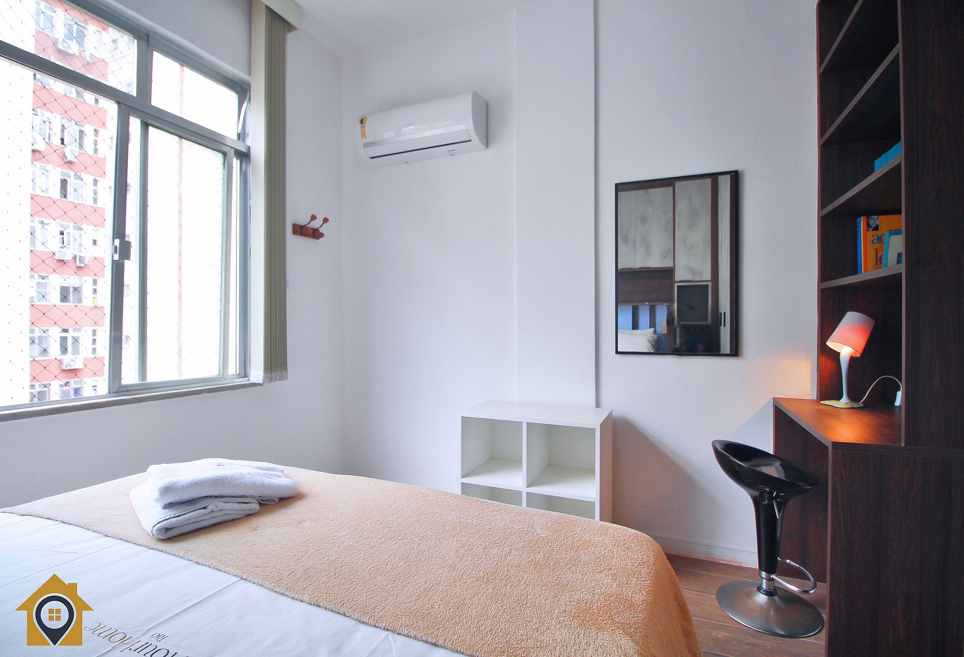 Este apartamento oferece conforto e praticidade para até 3 pessoas, com ambientes bem distribuídos e ótima estrutura. No quarto principal, você encontra uma cama de casal, mesa de trabalho/estudo com cadeira, ar-condicionado, ventilador de teto, espelho e janela voltada para a rua, garantindo boa iluminação natural.