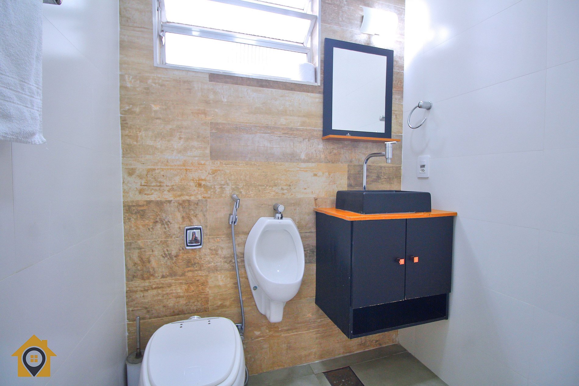 O banheiro é completo, contando com vaso sanitário, mictório, espelho e chuveiro elétrico.