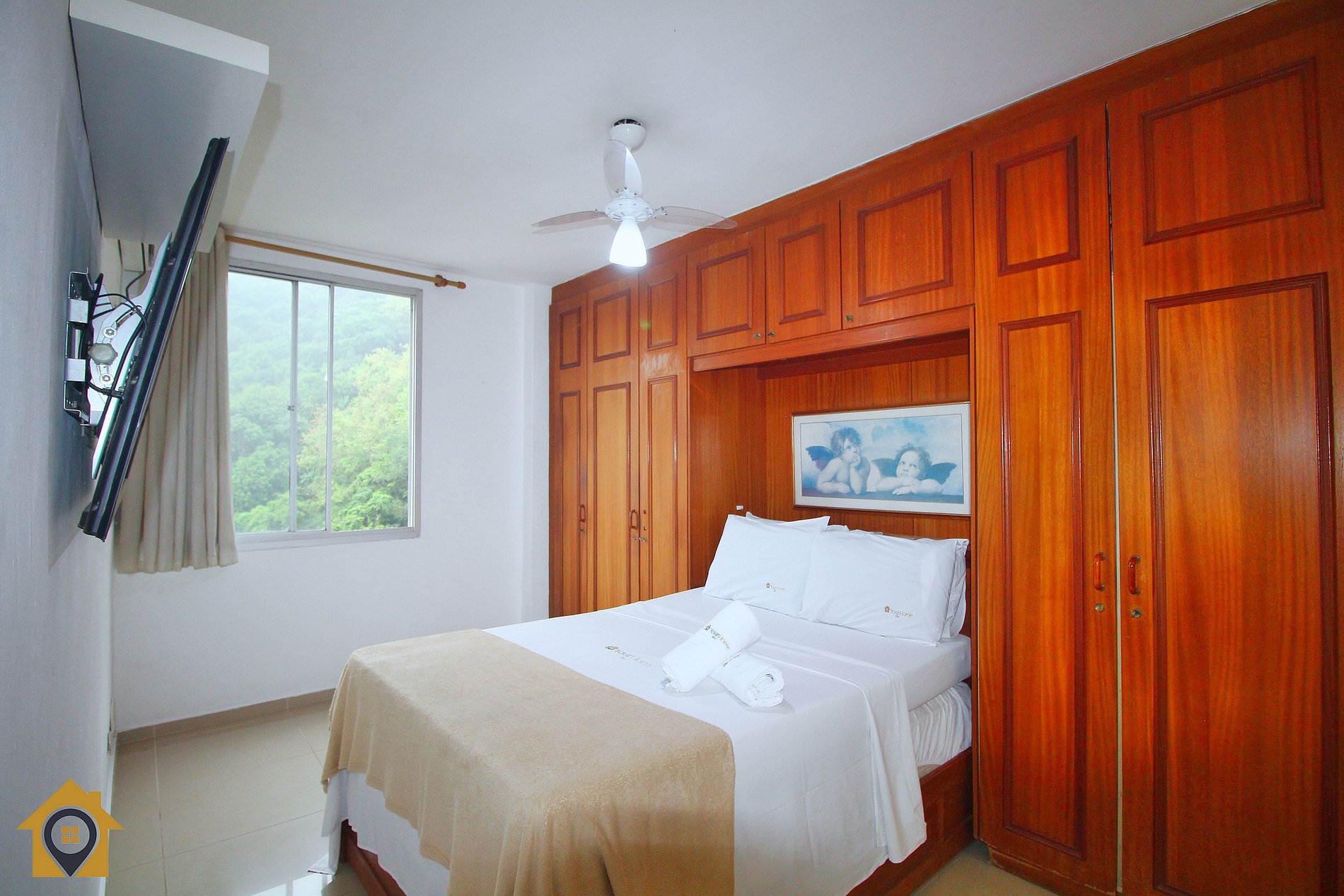 A suíte é completa e aconchegante, equipada com cama de casal, televisão, ventilador de teto, ar-condicionado, cortina blackout e banheiro interno com água quente.