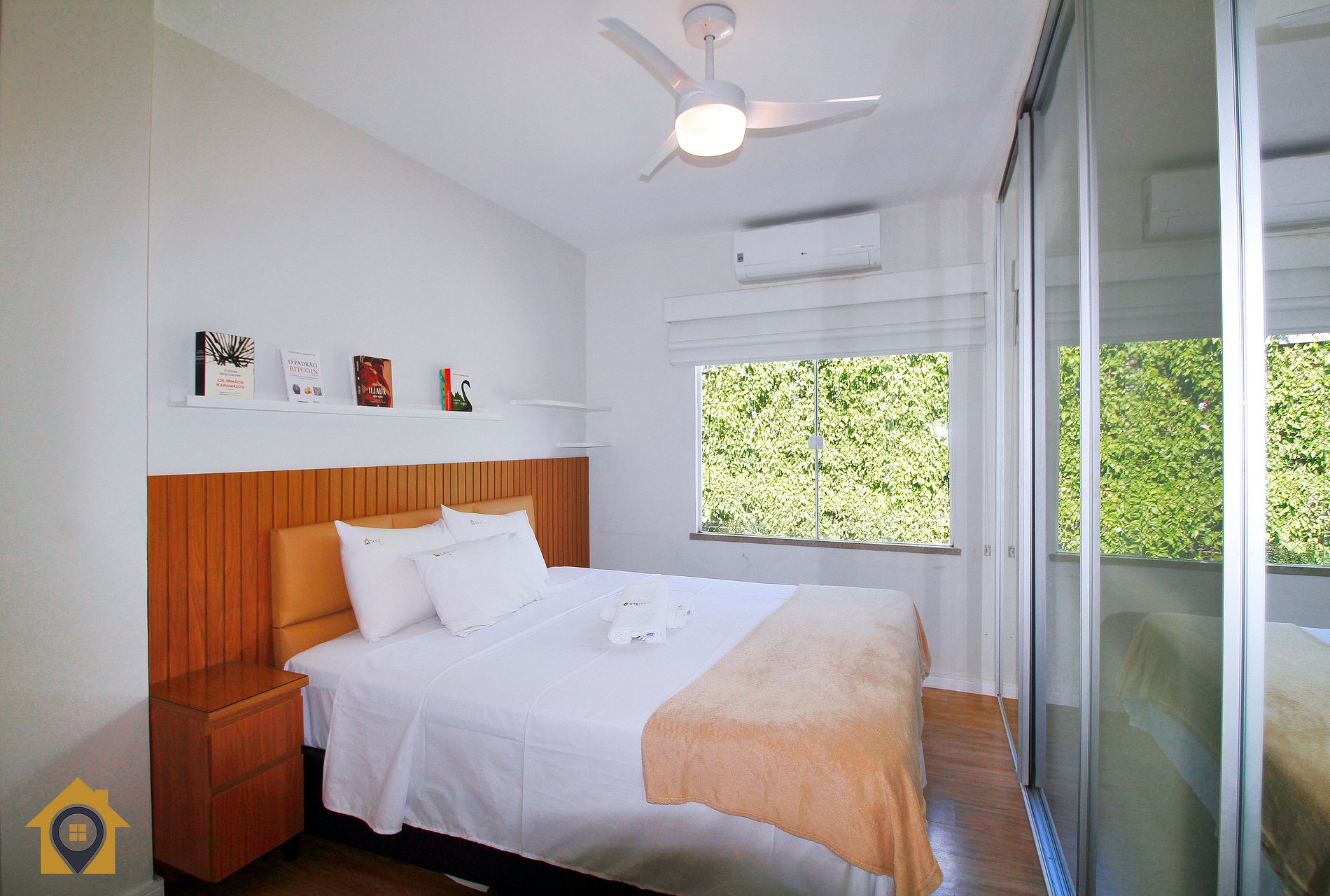 A suíte principal oferece uma experiência de conforto superior, com cama King size, guarda-roupa espaçoso, ar-condicionado, ventilador de teto, cortina blackout e uma agradável vista para a mata, proporcionando ainda mais silêncio e bem-estar.