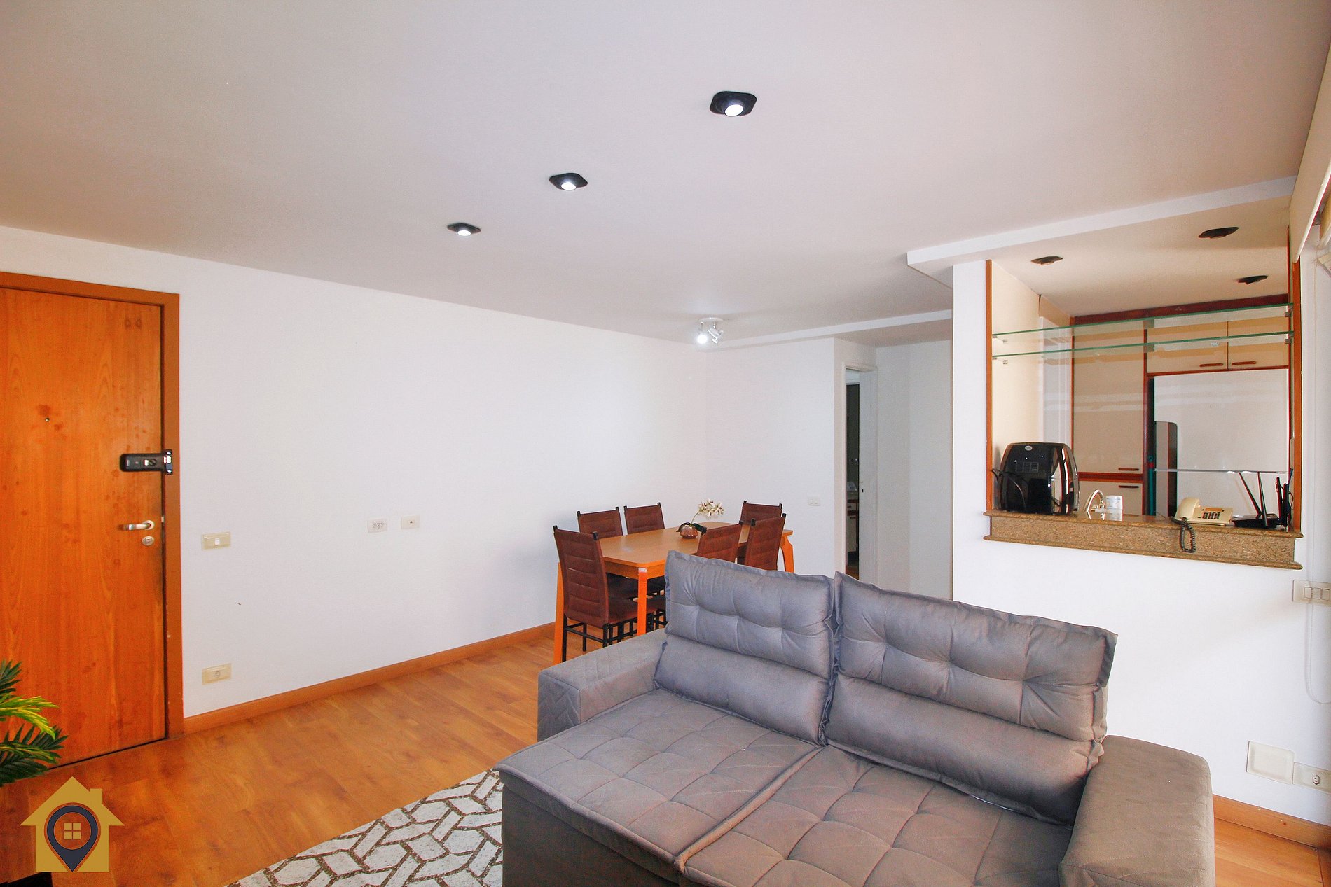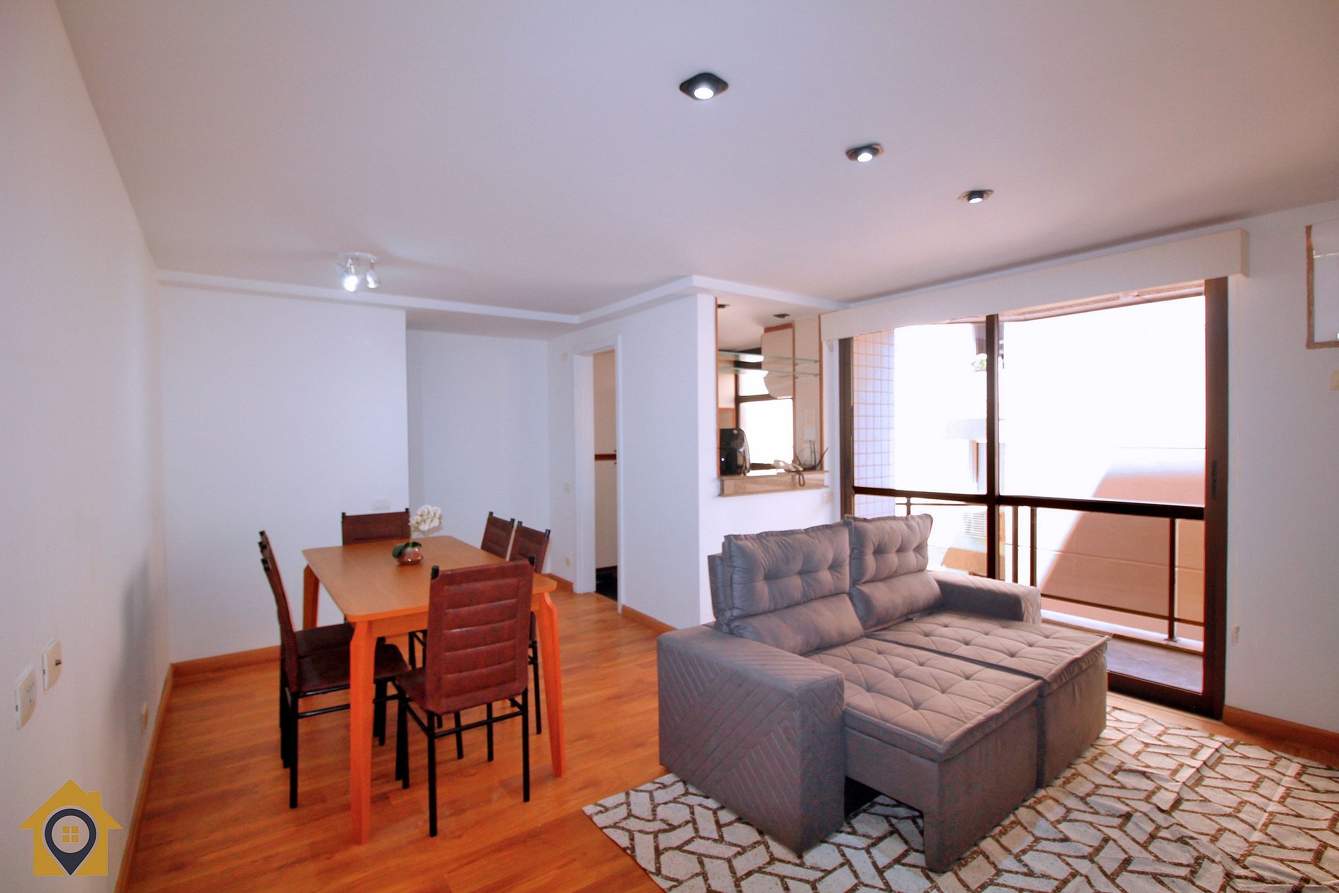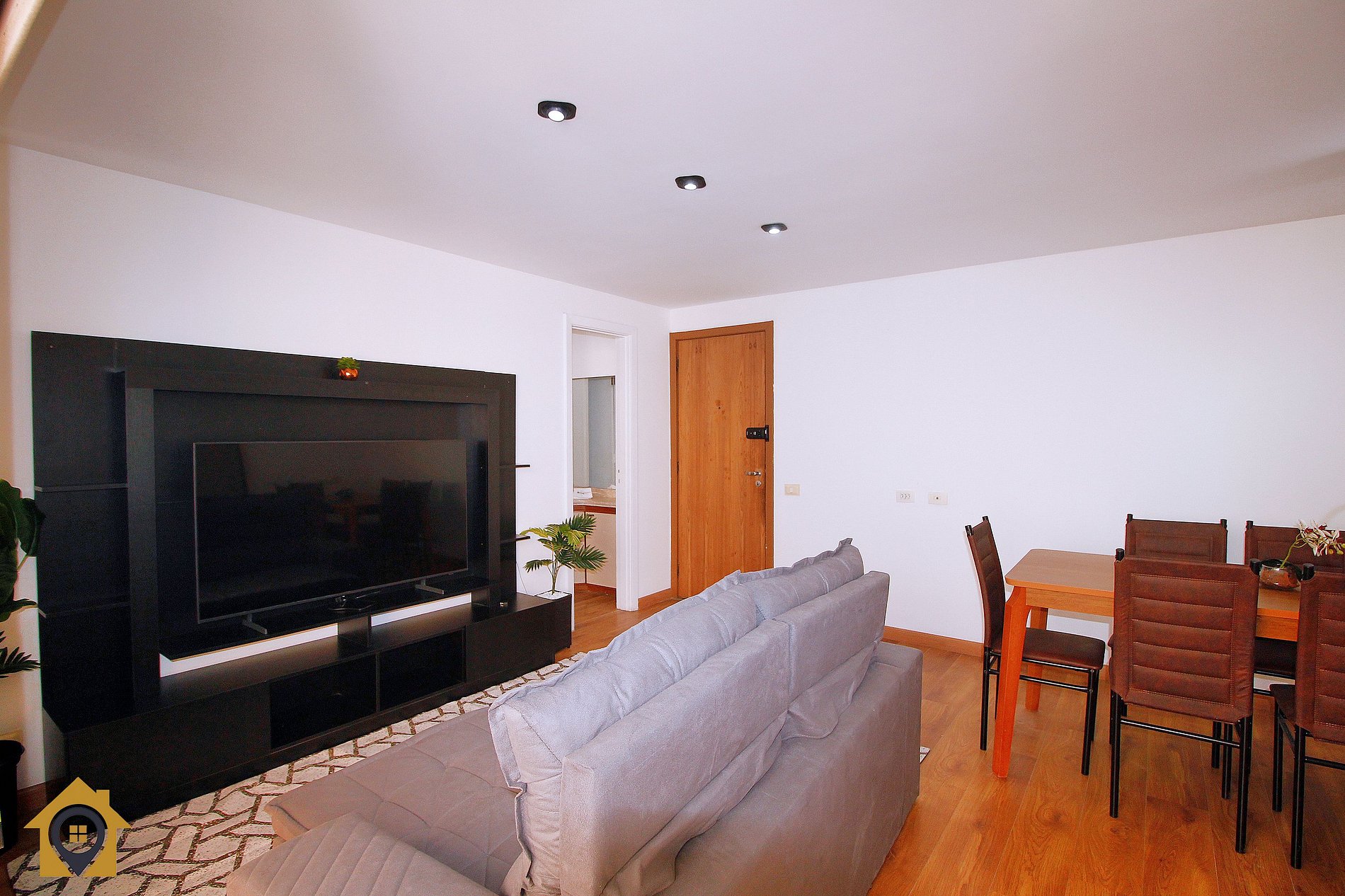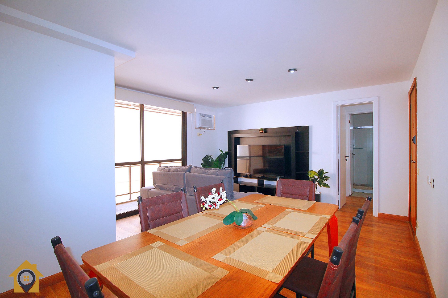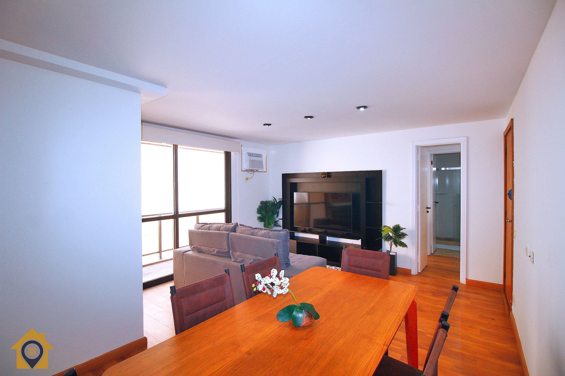 A sala é ampla e integrada à cozinha americana, com varanda que se conecta a uma das suítes, proporcionando mais conforto e iluminação natural. Conta com mesa de jantar para 6 pessoas, sofá retrátil, painel com TV de 50 polegadas e ar-condicionado.