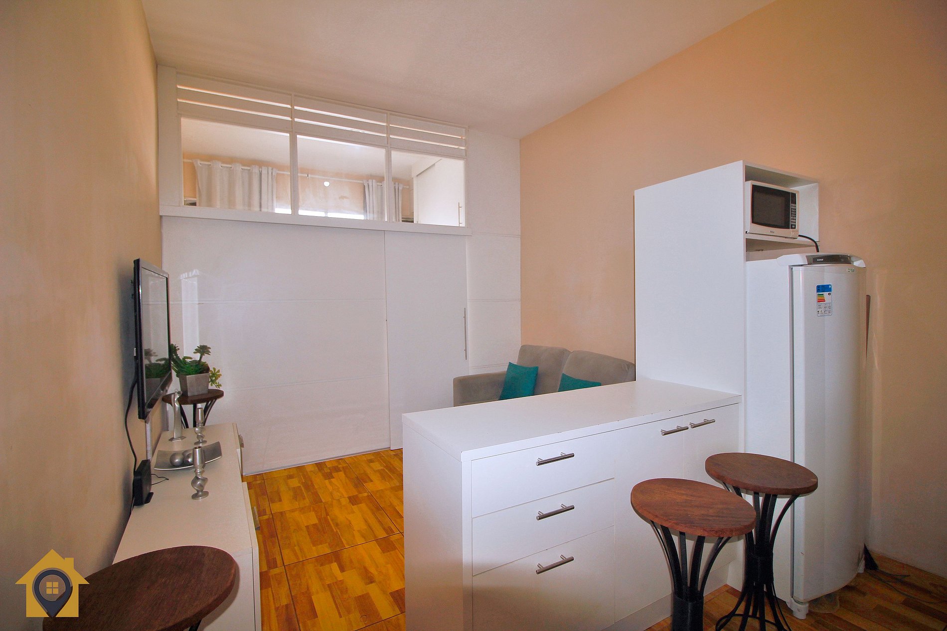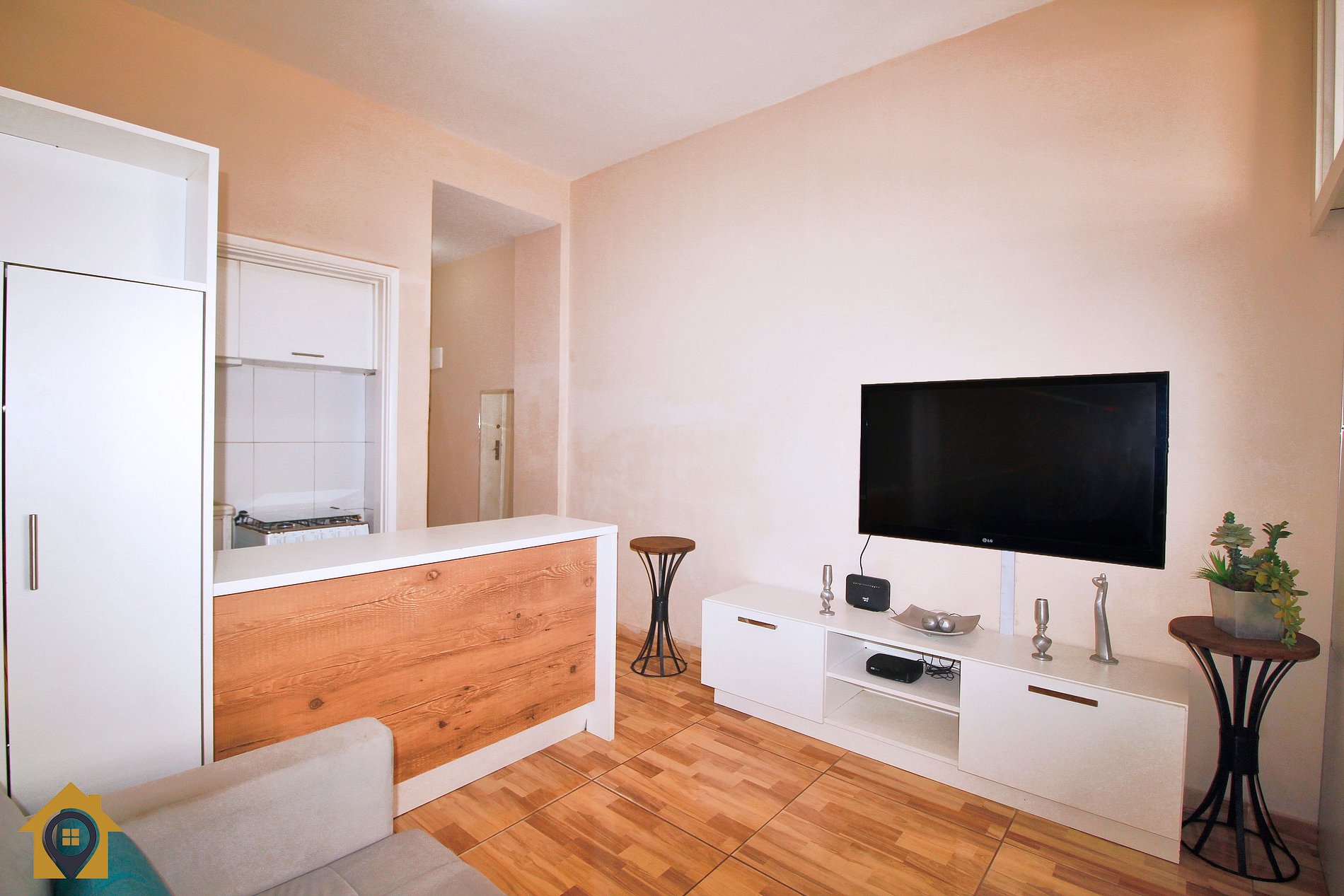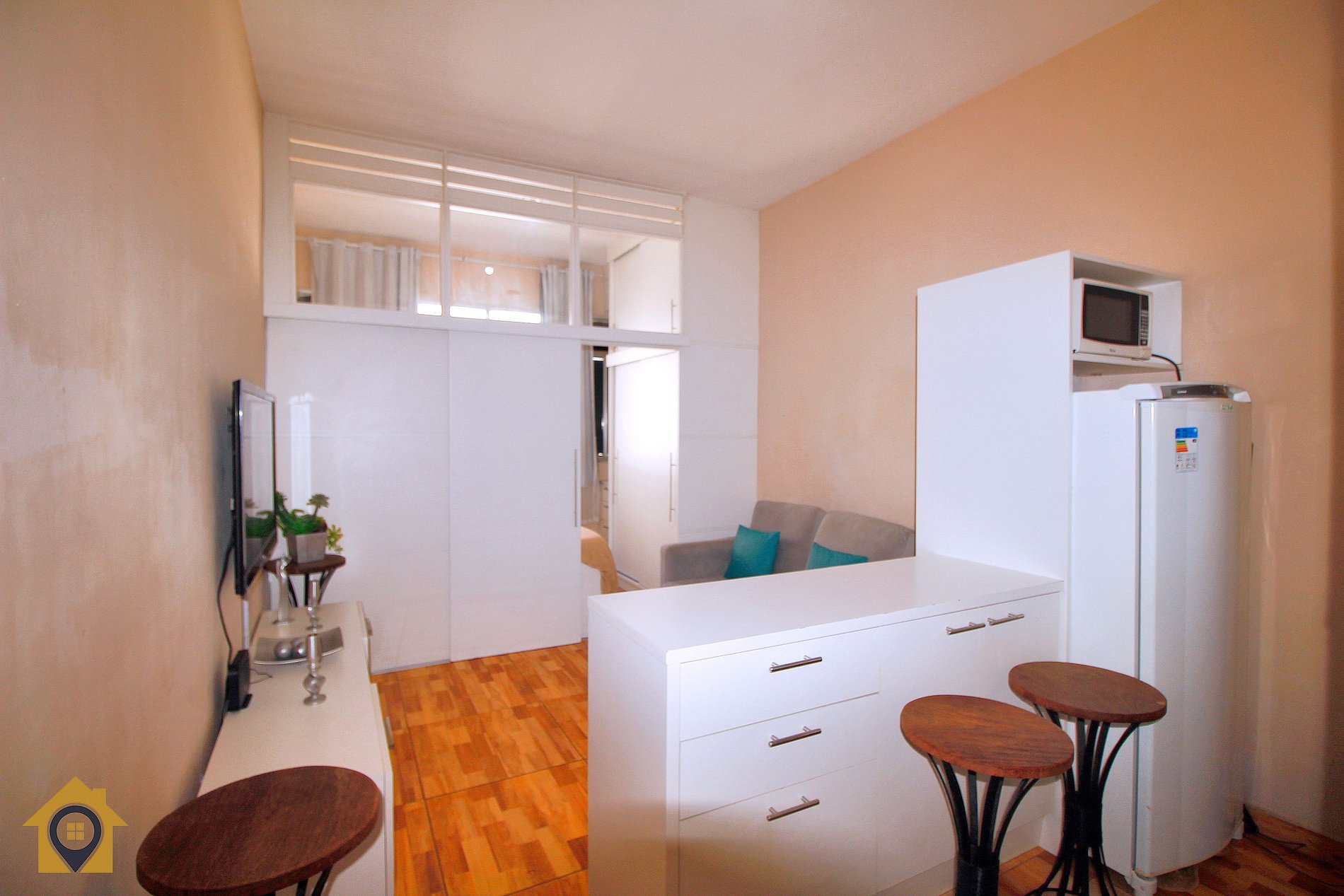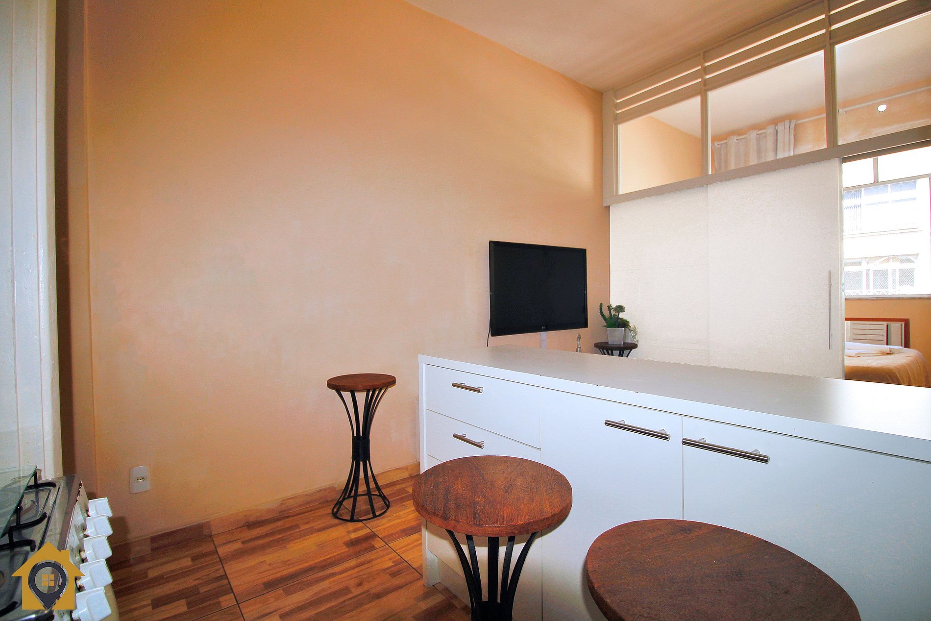 O apartamento é bem distribuído e pensado para oferecer conforto e praticidade. A sala de estar conta com sofá-cama, TV de 40 polegadas, armário de duas portas e uma bancada com duas cadeiras altas, integrada à cozinha, criando um ambiente moderno e funcional.