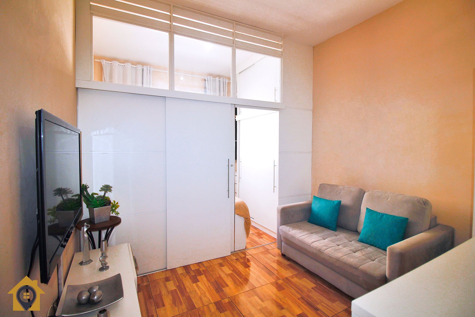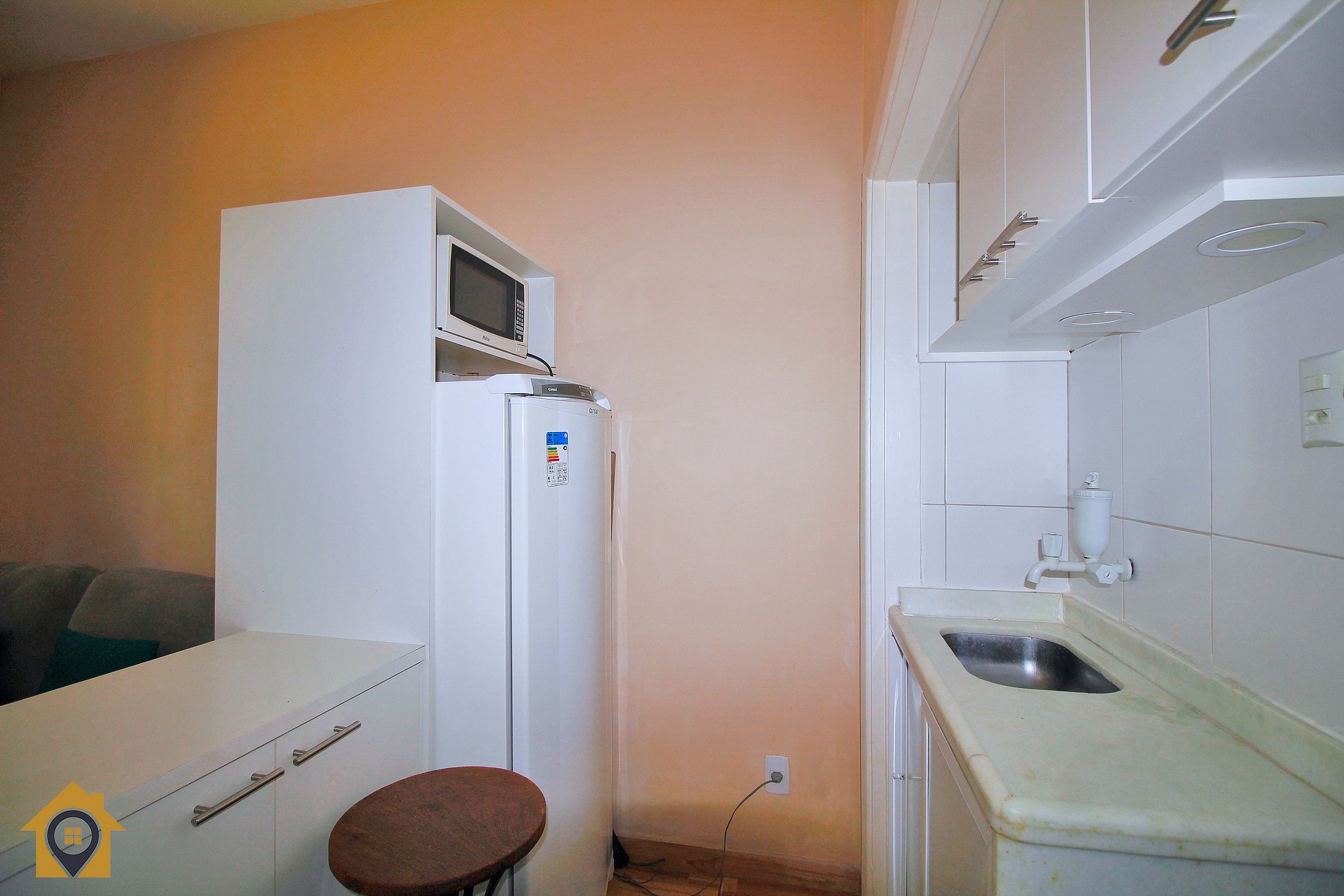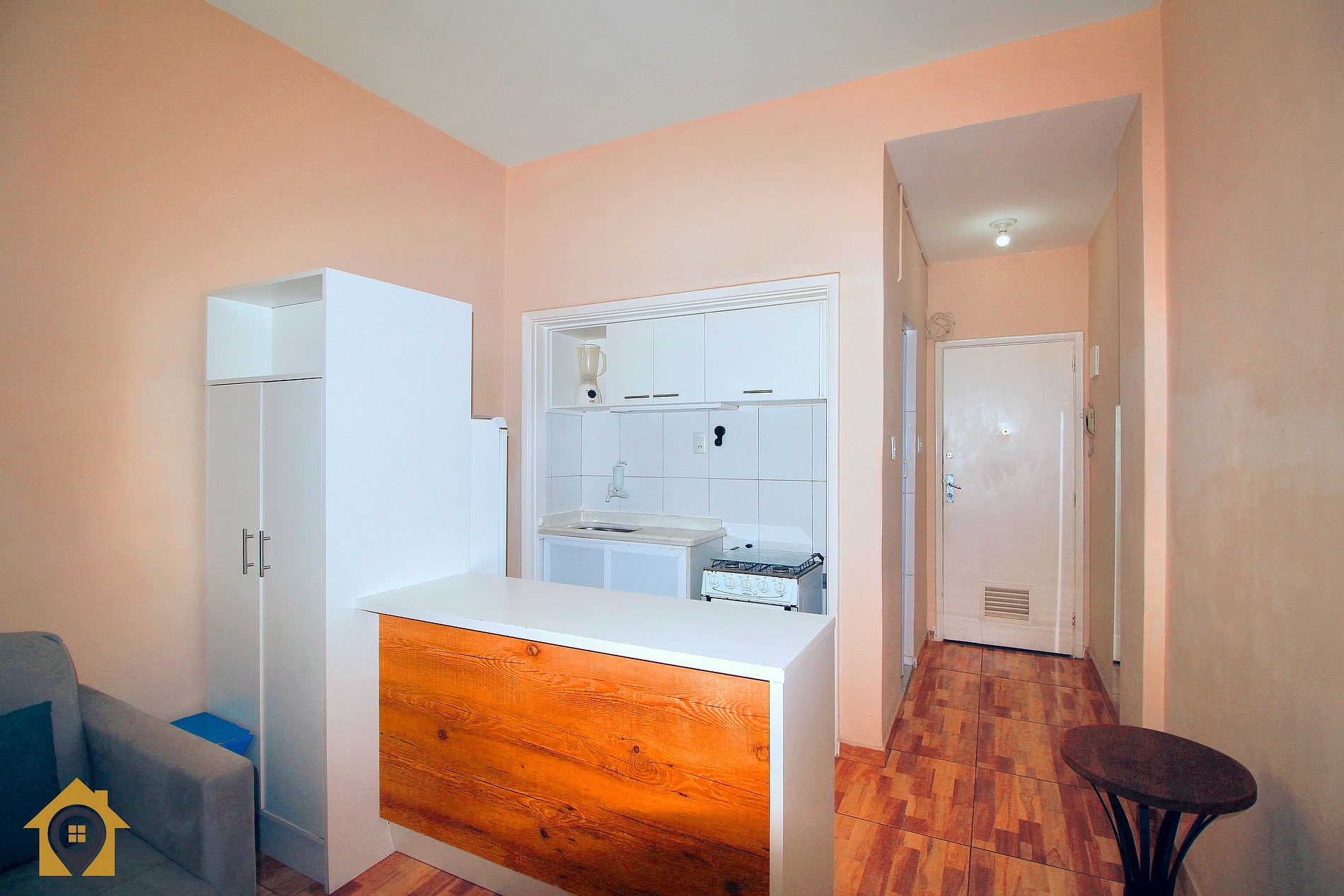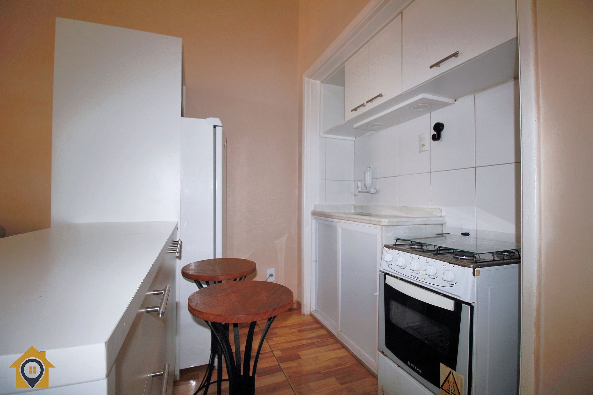 O apartamento é bem distribuído e pensado para oferecer conforto e praticidade. A sala de estar conta com sofá-cama, TV de 40 polegadas, armário de duas portas e uma bancada com duas cadeiras altas, integrada à cozinha, criando um ambiente moderno e funcional.