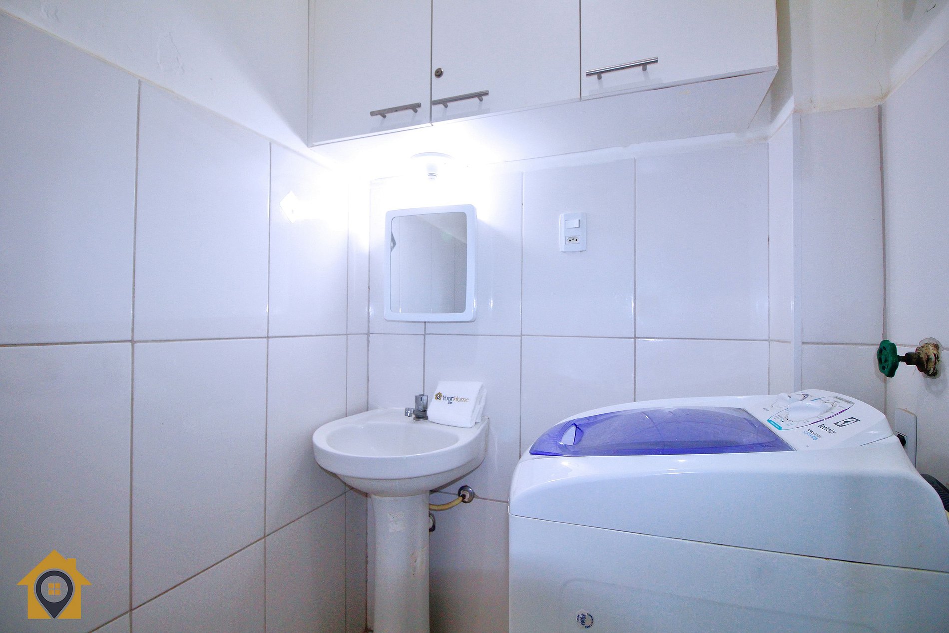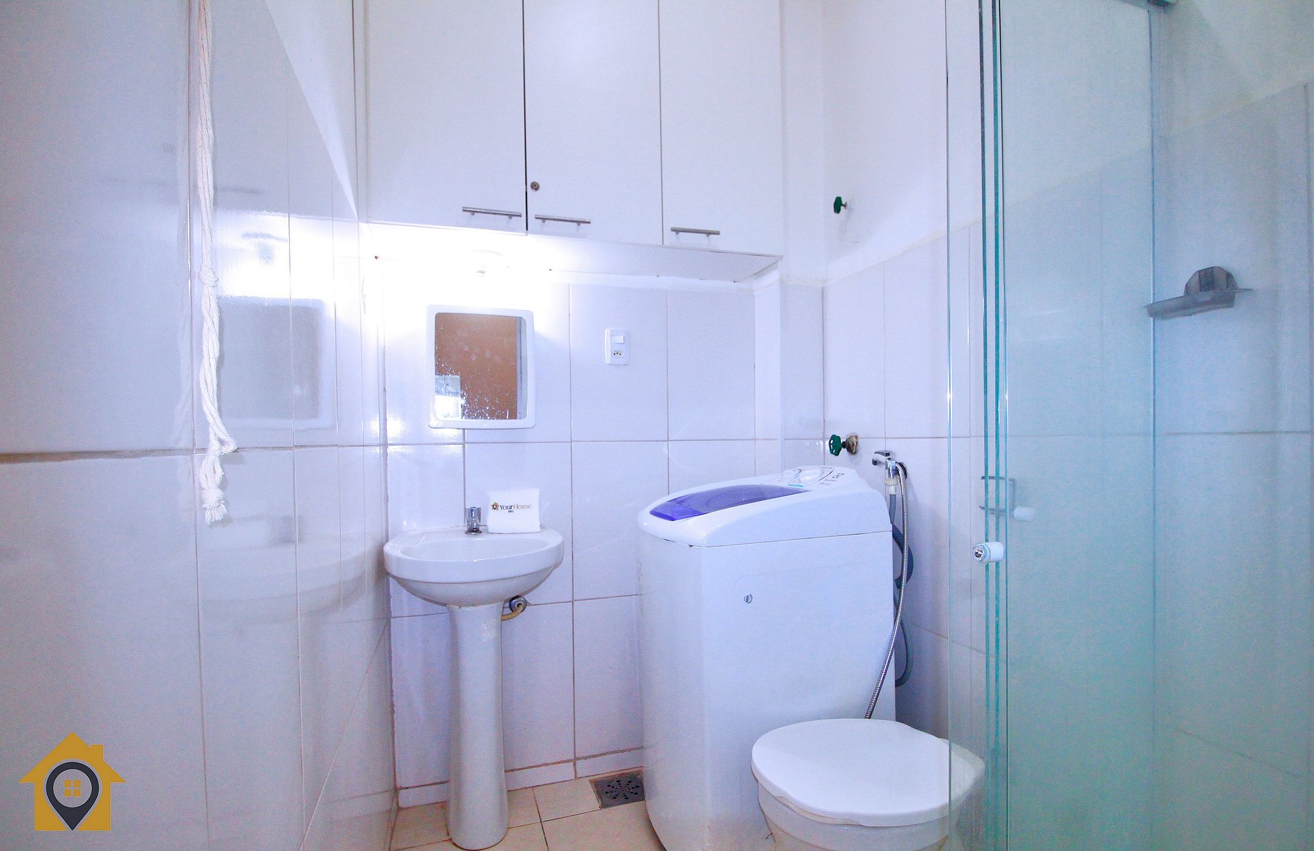 O banheiro é equipado com água quente, máquina de lavar e varal de teto, oferecendo mais comodidade para estadias curtas ou longas.