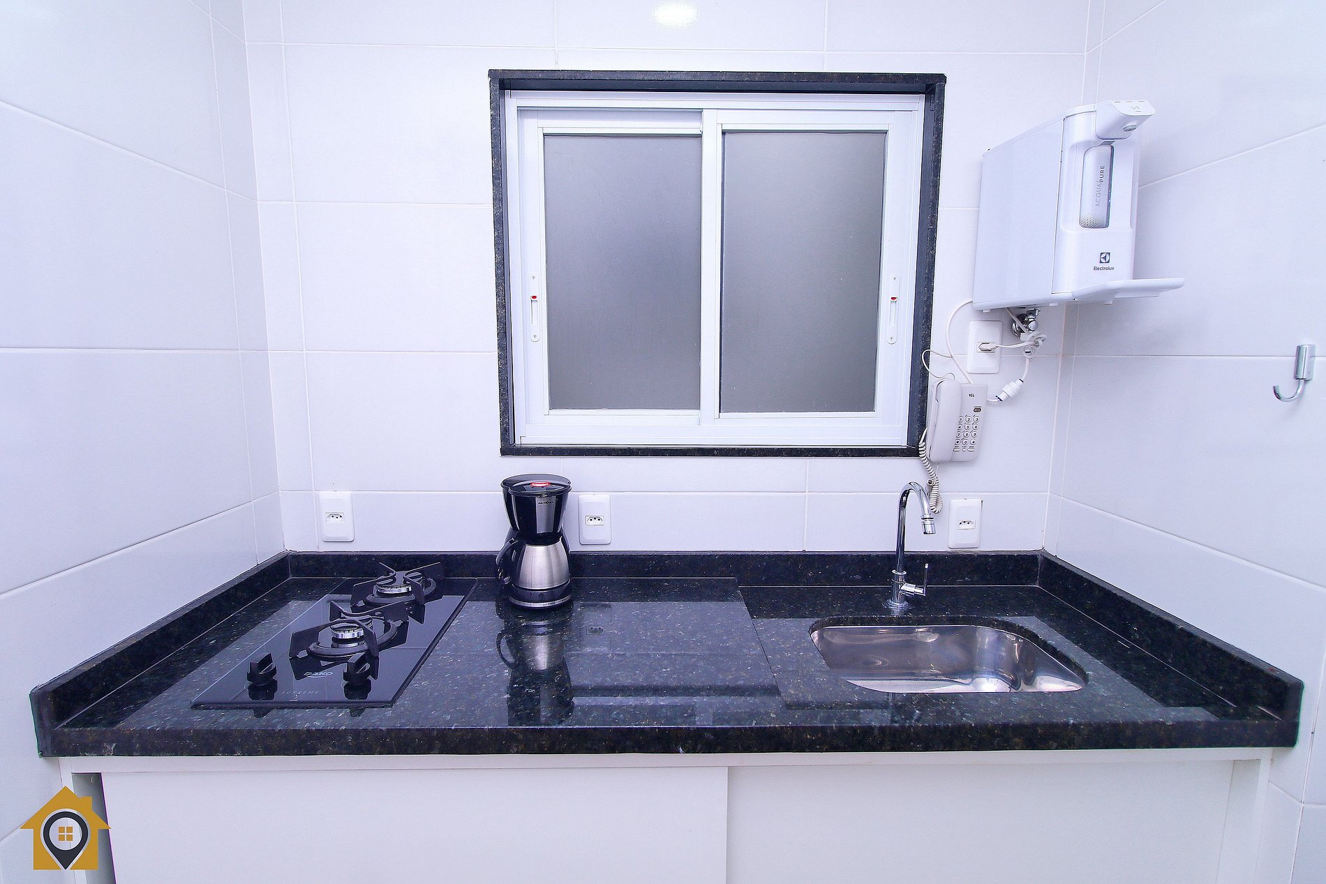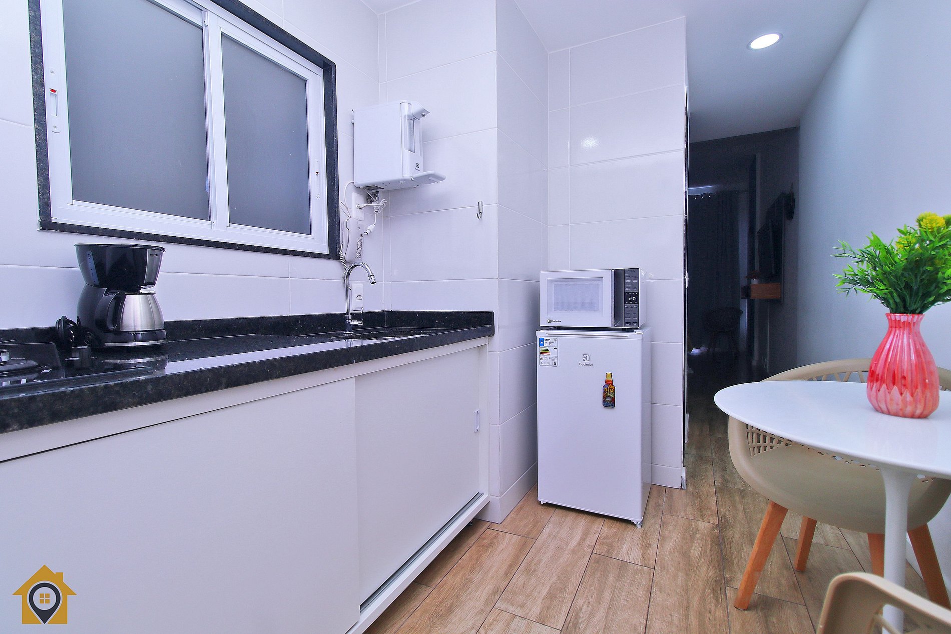 Cozinha: Completa com fogão cooktop, filtro de água, micro-ondas, frigobar, mesa com duas cadeiras e utensílios necessários para cozinhar.