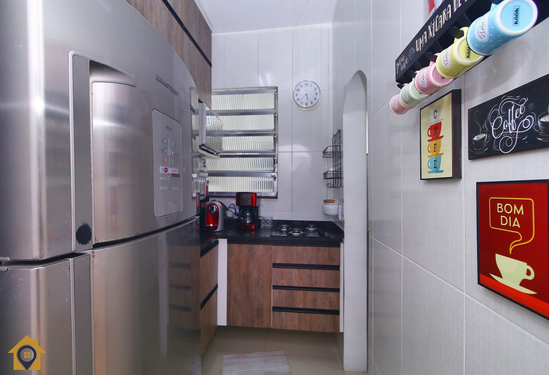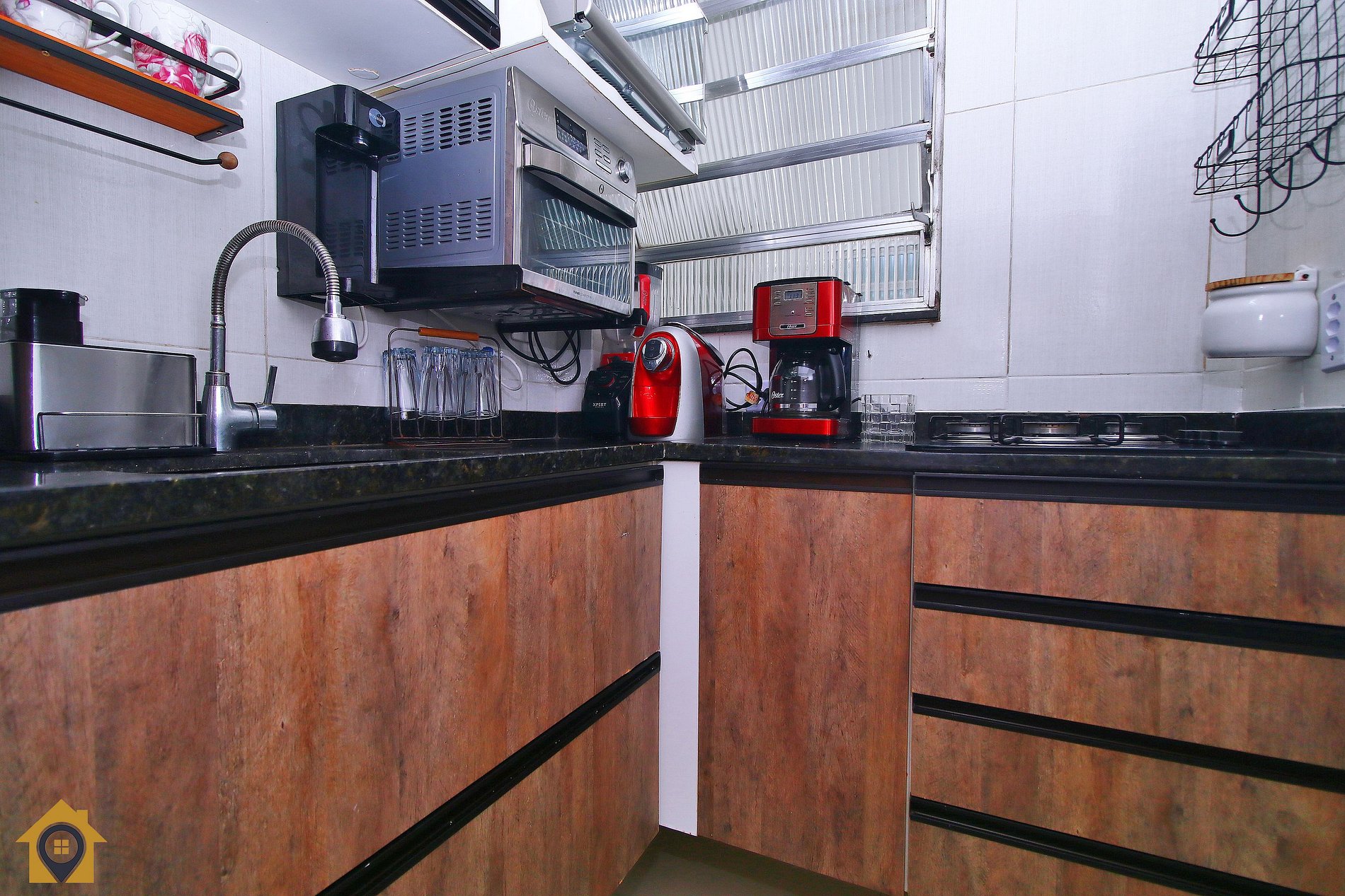 Cozinha completa com cooktop de 3 bocas, micro-ondas, forno elétrico, geladeira, cafeteira que acomoda cápsulas e café em pó, além de utensílios para preparar suas refeições com conforto e praticidade.
