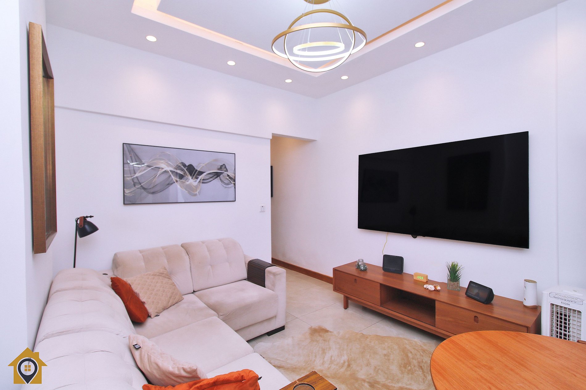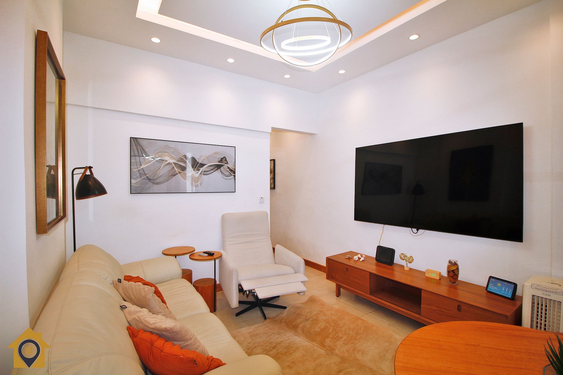 Ampla sala equipada com TV de 75 polegadas, Alexa para controle de dispositivos inteligentes, mesa com 2 cadeiras, sofá retrátil, luminária moderna e Wi-Fi de alta velocidade.