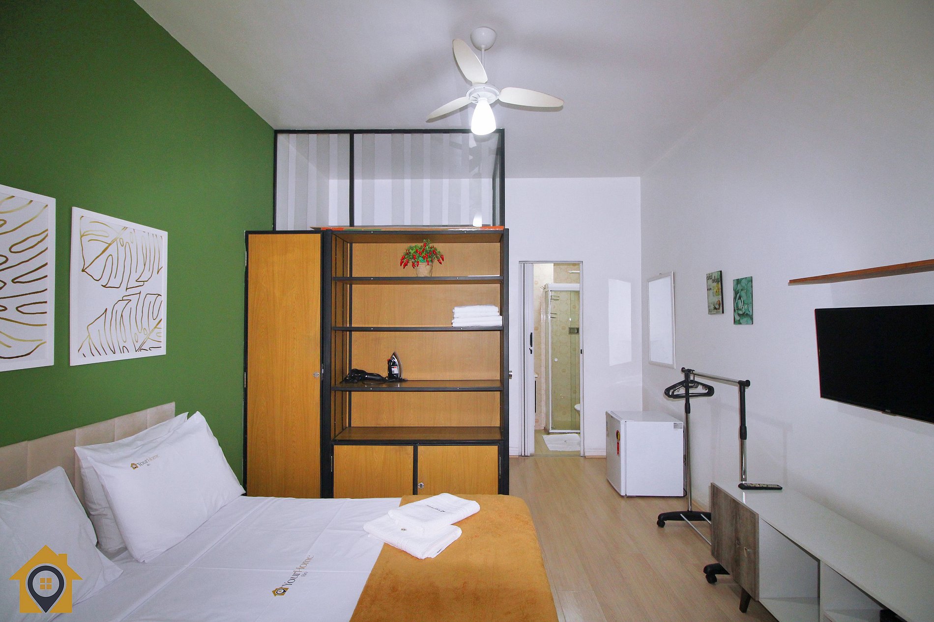 O quarto, bem decorado, conta com cama de casal, armário, mesa de cabeceira, ventilador de teto e ar condicionado para garantir o seu descanso após um dia agitado. A TV de 32 polegadas oferece entretenimento, e a janela para a rua traz a energia da cidade para dentro do seu espaço.