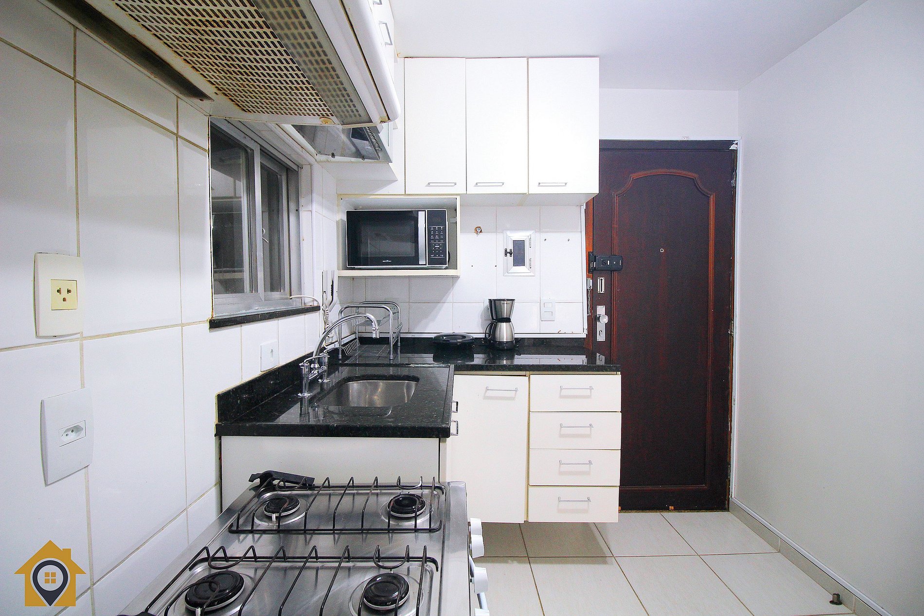 A cozinha completa oferece tudo o que você precisa para preparar suas refeições com praticidade: micro-ondas, fogão com forno e geladeira estão à disposição para garantir funcionalidade e comodidade.