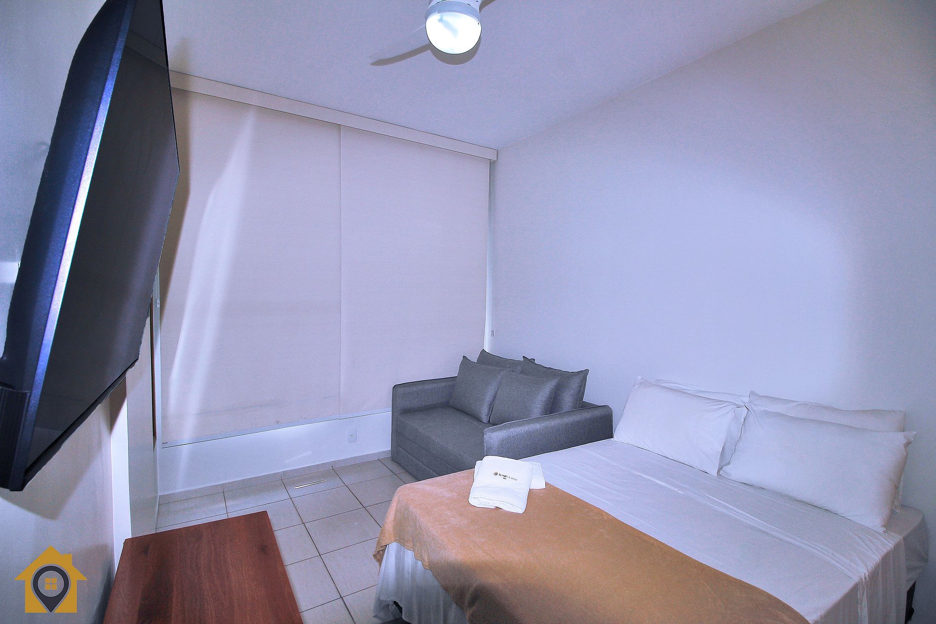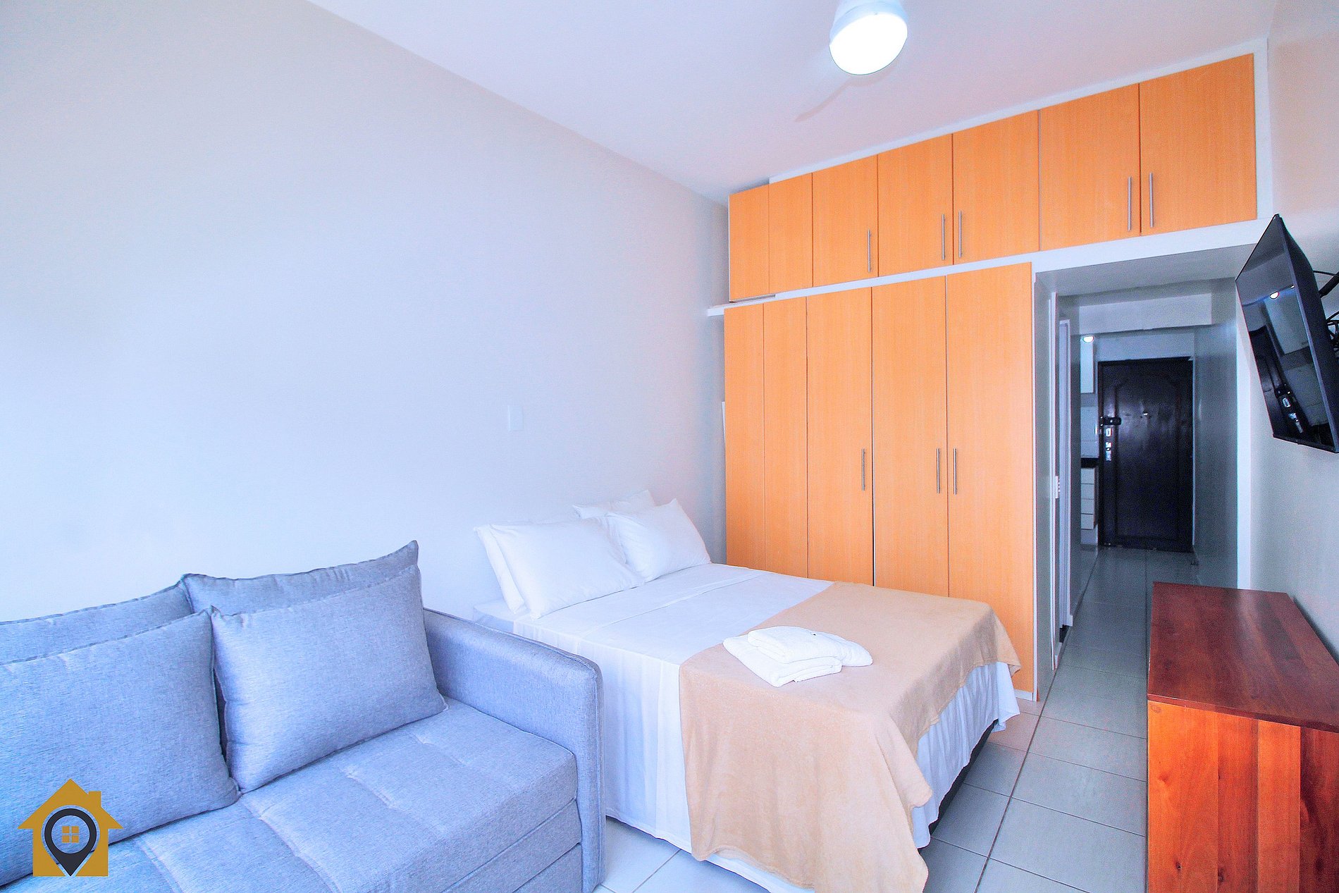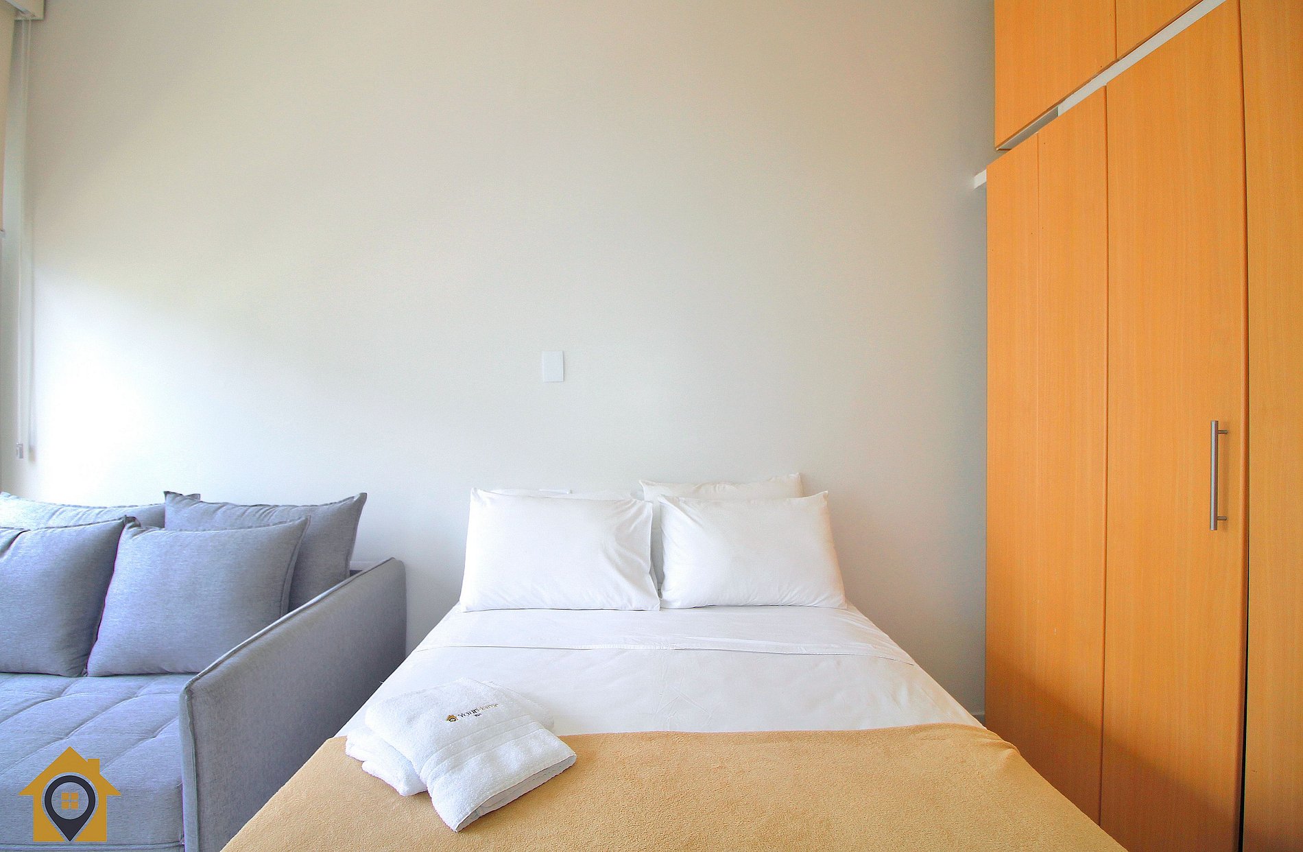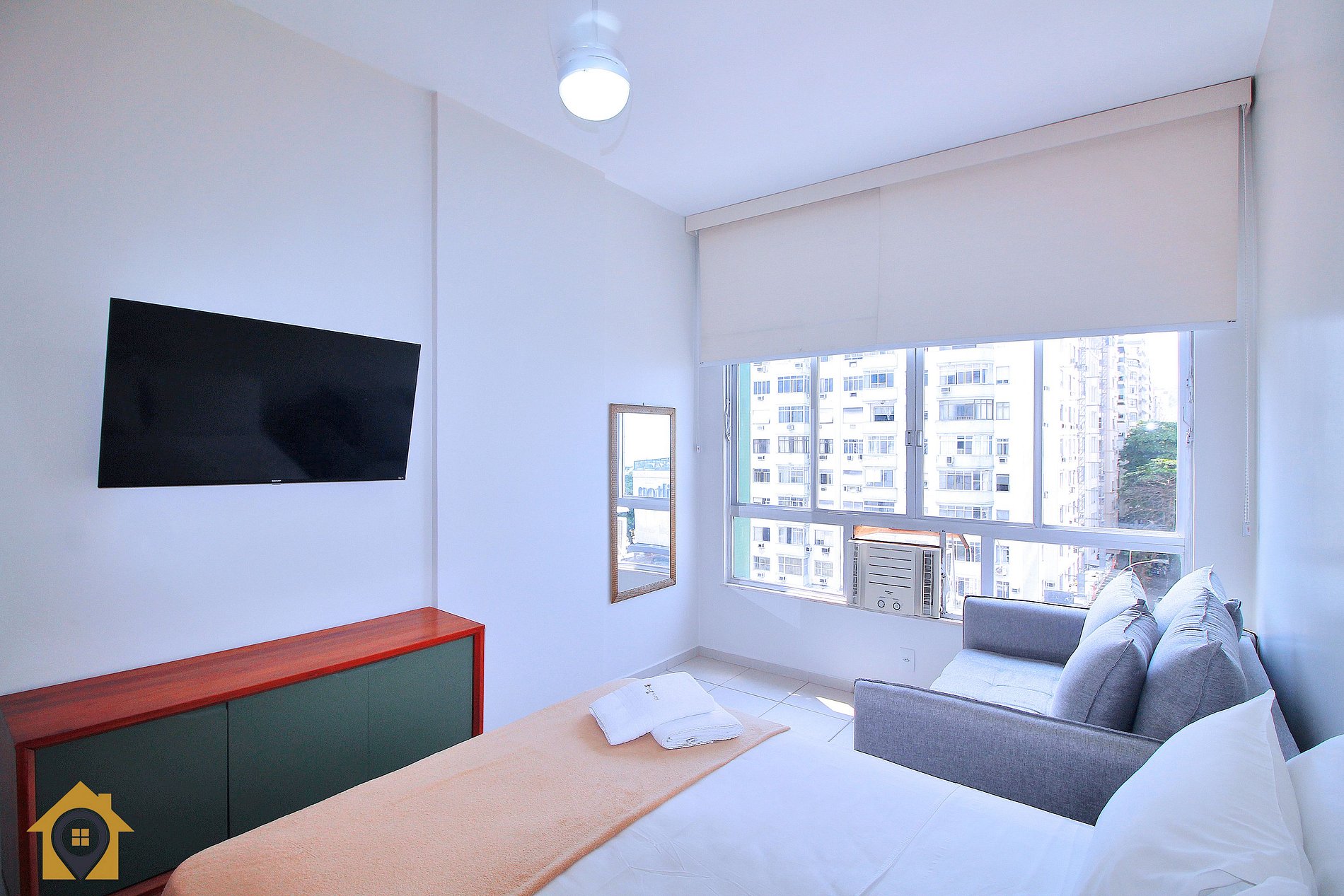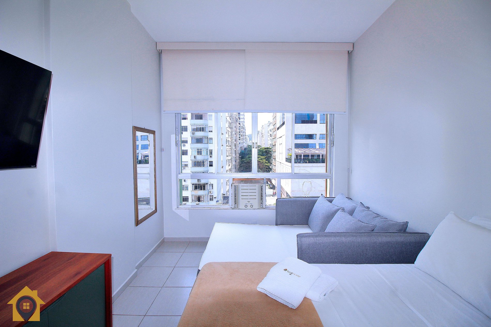 O ambiente foi projetado para acomodar até 4 pessoas com conforto e sofisticação. O studio conta com uma cama de casal e um sofá-cama de casal, proporcionando um descanso tranquilo após um dia explorando o Rio. A decoração clean e moderna torna o espaço ainda mais acolhedor, enquanto a TV de 43 polegadas garante entretenimento de qualidade. Para os dias quentes, o ar-condicionado mantém o ambiente sempre agradável.