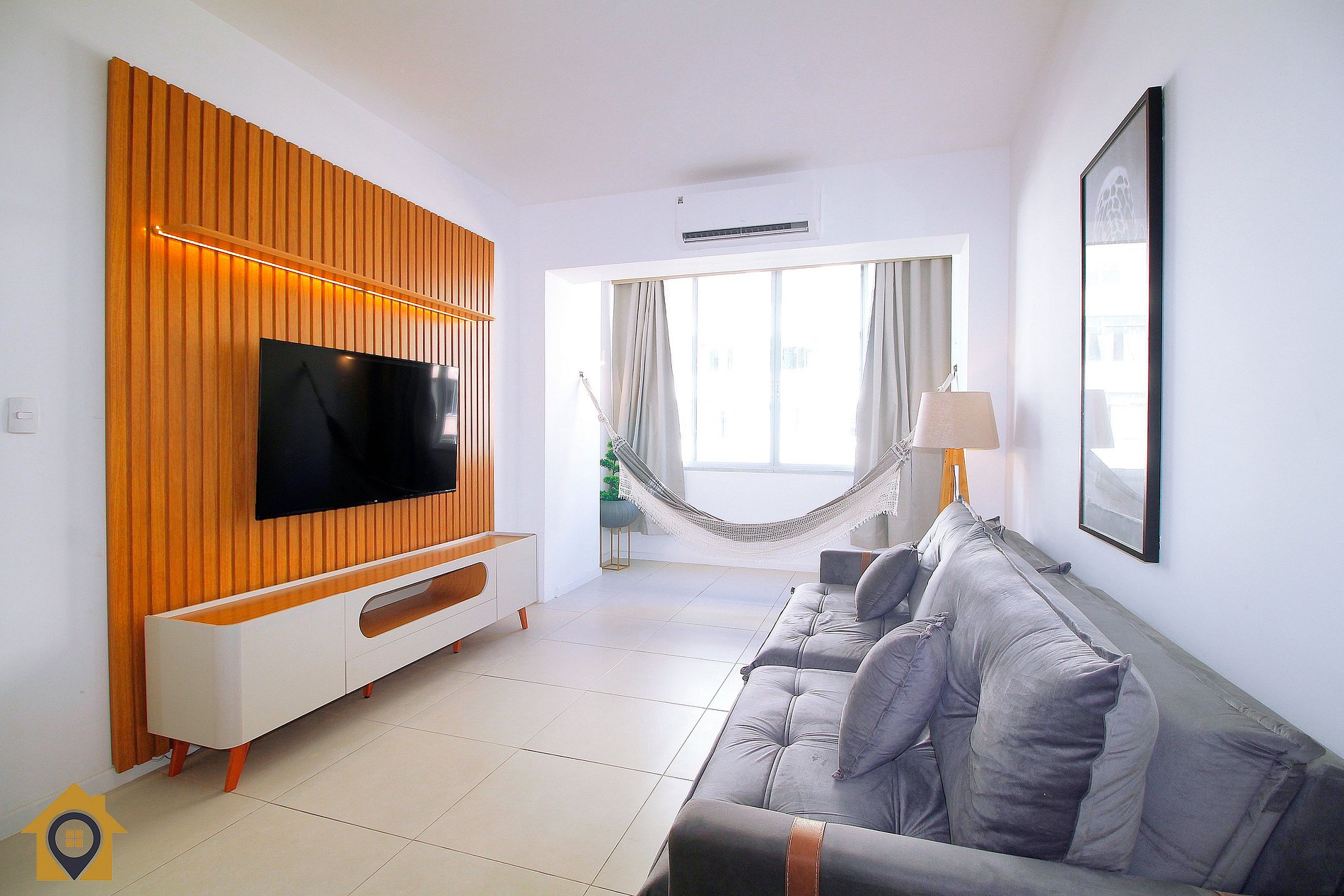Este apartamento é perfeito para uma estadia confortável e prática. A sala é estilosa e aconchegante, equipada com um sofá-cama bastante confortável para até 2 pessoas, ar-condicionado, luminária, Smart TV de 60 polegadas e uma rede de descanso para relaxar. A sala também conta com uma mesa de jantar com 6 cadeiras, ideal para refeições em grupo.