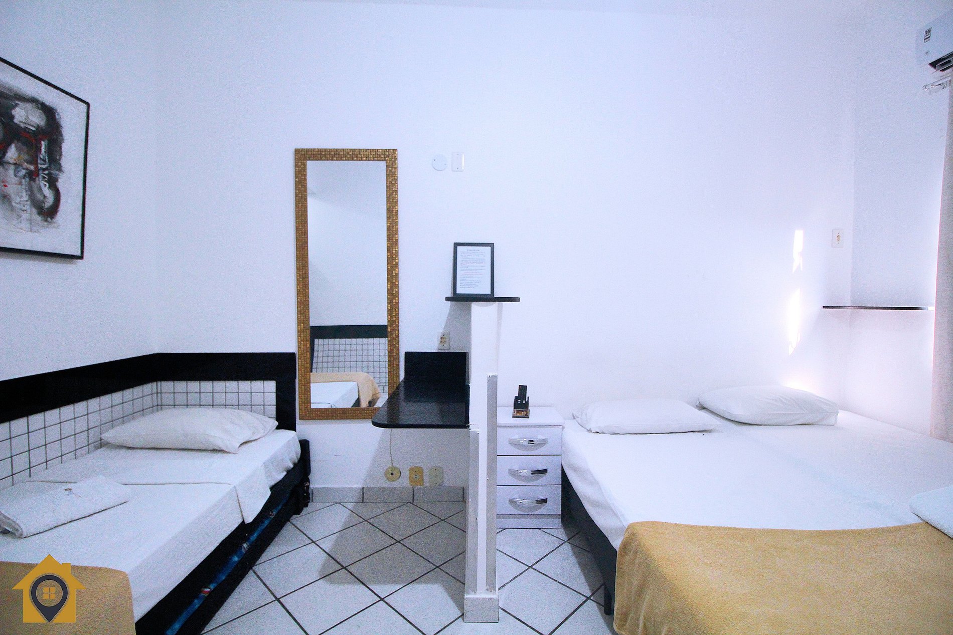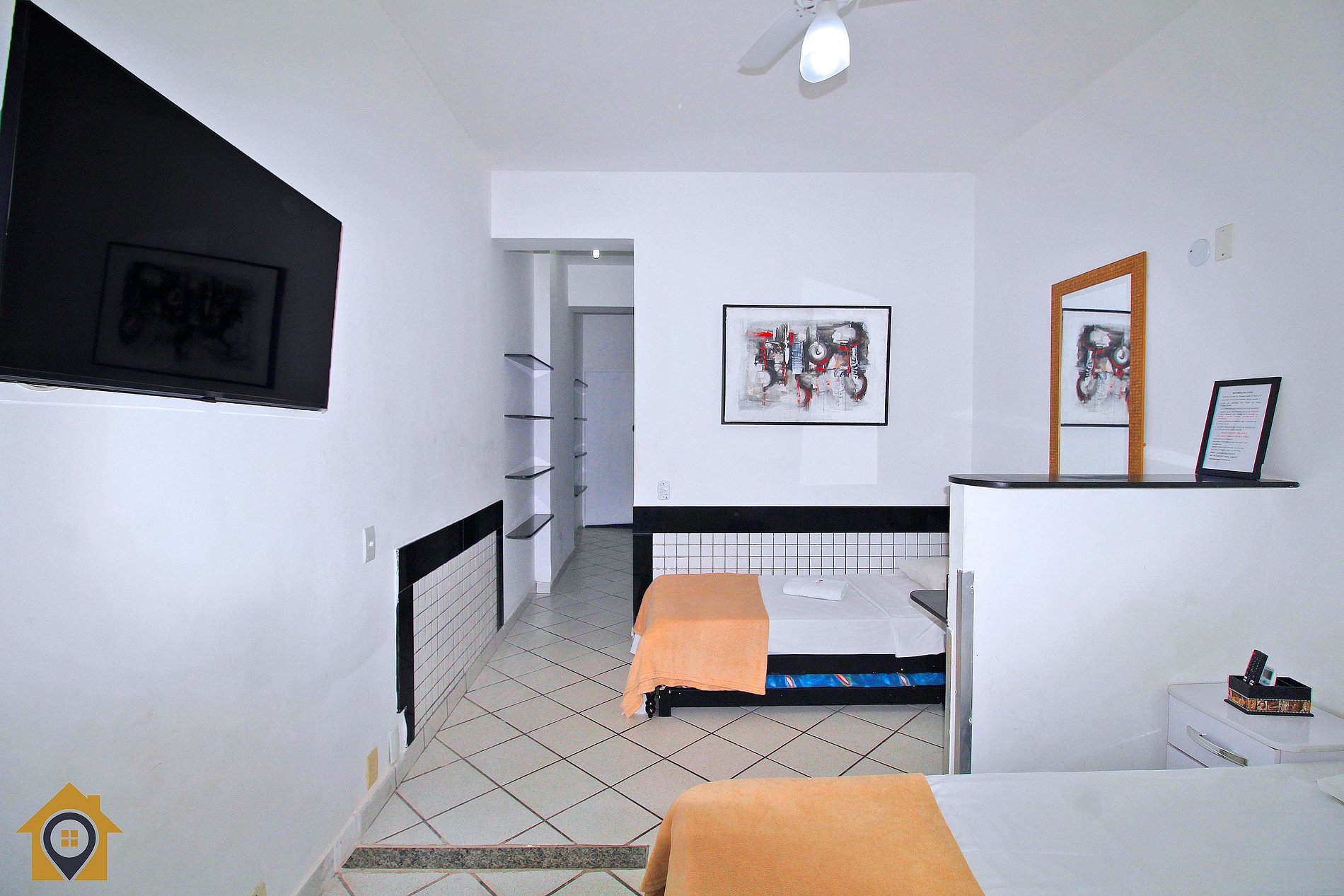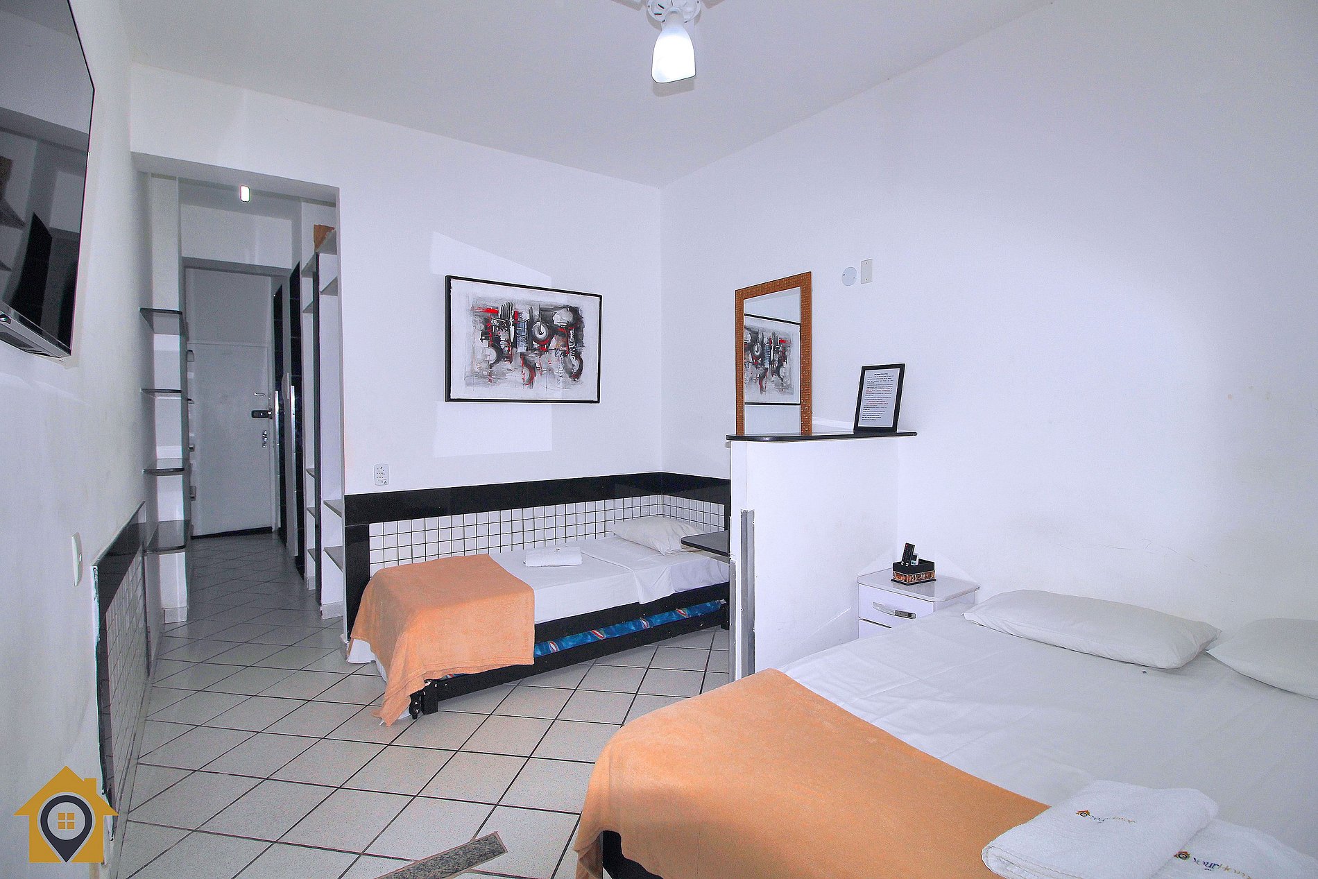 Apartamento na quadra da praia com portaria 24 horas. Quarto com duas bicamas de solteiro e uma cama de solteiro, acomodando até 5 pessoas. Conta com TV smart de 43 polegadas, ar-condicionado, cortina blackout e espelho grande. A cozinha é equipada com utensílios, cafeteira, micro-ondas e fogão. O banheiro possui água quente, garantindo conforto durante a estadia.